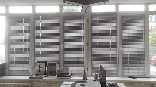 Для создания комфортного и профессионального рабочего пространства в офисе серые стильные матовые алюминиевые горизонтальные жалюзи HOLIS.