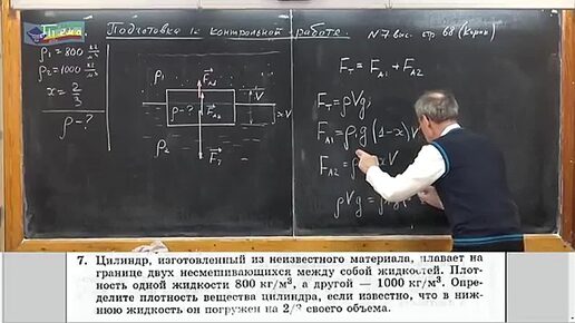 Задача на тему определения плотности вещества цилиндра, плавающего на границе двух жидкостей.