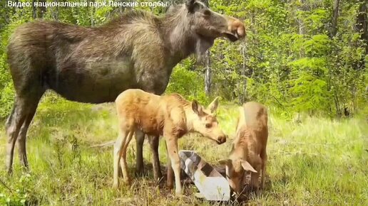 Мама-лосиха с двойняшками! 😍 Один малыш сразу пошёл знакомиться с камерой — видимо, мечтает стать блогером🦌✨| Что-то на дальневосточном