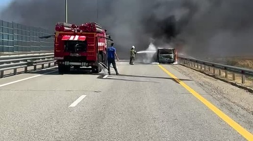 Микроавтобус сгорел после проезда по Крымскому мосту Машина проехала мост со стороны Керчи и загорелась уже на подходах к мосту со стороны