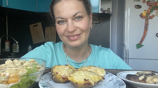 МУКБАНГ ФАРШИРОВАННЫЙ КАРТОФЕЛЬ/САЛАТ ЦЕЗАРЬ/ГРИБЫ ЗАРЕЧЕННЫЕ ПОД СЫРОМ/MUKBANG ЕДА ОБЖОР