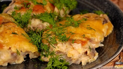 Нежная питательная запеканка. Рыба, запечённая под грибами