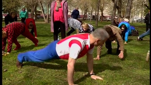 Десятки человек в Первомайском сквере тянут резину и позвоночник