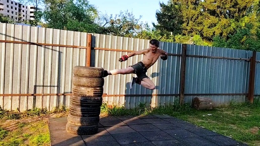 Упражнение с шинами в утяжелителях "Терминатор". Серии ударов руками и ногами.