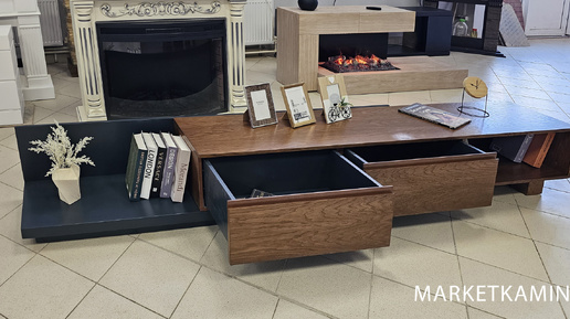 Раздвижная ТВ-тумба-трансформер с выдвижными ящиками и открытой нишей