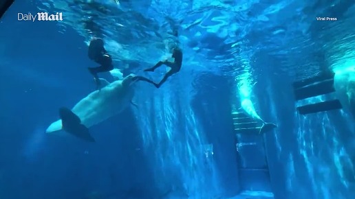 Это вас заперли со мной: кит-белуха попытался укусить дайверов во время шоу в Китае