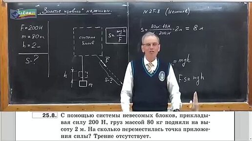 Задача на определение перемещения точки приложения силы при подъеме груза с помощью системы невесомых блоков