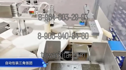 Станок для упаковки онигири. Работа оборудования для производства рисовых треугольников.