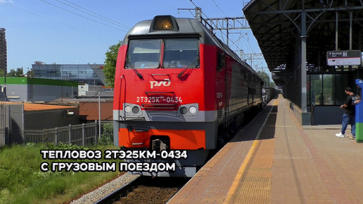 Тепловоз 2ТЭ25КМ-0434 с грузовым поездом, проследует платформу Кучино (МЦД-4)