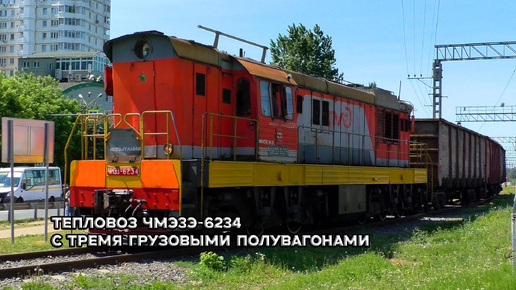 Тепловоз ЧМЭ3Э-6234 с тремя грузовым полувагонами, заезжает на подъездной путь