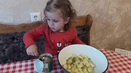 "Горошковый" салат умеет готовить Ева в 2 года. Нам всем нравится её вариант "оливье". Как готовить еду вместе с детьми.