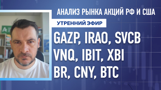 Анализ рынка акций РФ и США/ GAZP, IRAO, SVCB, VNQ, IBIT, XBI/ BR, CNY, BTC