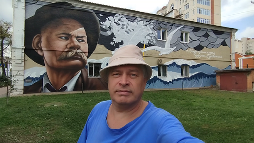 На здании мурал: Максим Горький. Геннадий Горин возле мурала