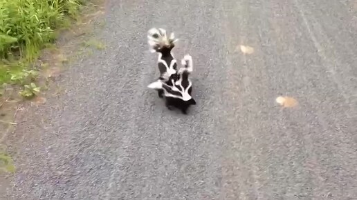 Семейство скунсов подошло изучить велосипед парня — в процессе они активно делились впечатлениями, издавая звуки, похожие на маппетов