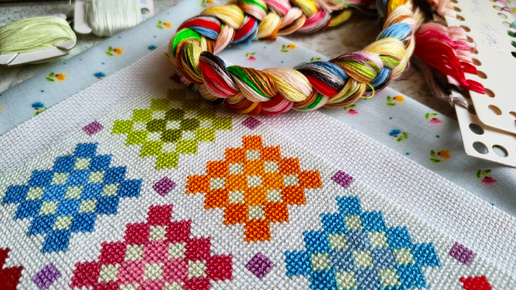 Образец бабушкиного лоскутного одеяла. Вышивка остатками ниток на остатках Аиды.