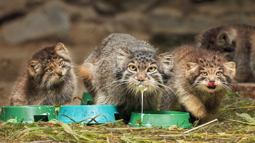 Мама манул с котятами пьют молоко: молочный вальс между мисками в Новосибирском зоопарке!