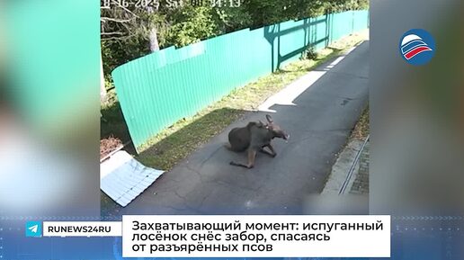 Захватывающий момент: испуганный лосёнок снёс забор, спасаясь от разъярённых псов
