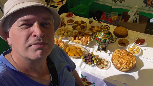 Палатка: Гуторовское сельское поселение. На столе: Булочки, печенье, кукуруза, яблоки и самовар. Геннадий Горин