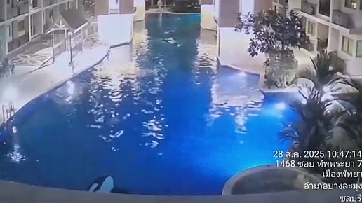 Трагедия в Паттайе: Лена Бикетова поплавав в бассейне, пытается подняться по ступеням (ее видно сквозь кусты), но падает.