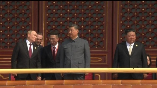 Путин — справа, Ким Чен Ын — слева от Си Цзиньпина на параде в Пекине: видео из Китая