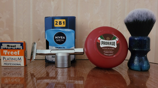 Почти кассетная бритва с лезвиями Treet Platinum, мыло Proraso красное, помазок Yaqi, лосьон Nivea
