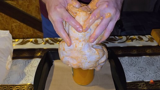 Курица, приготовленная методом запекания на стеклянной емкости с использованием тыквенного сока в качестве маринада и теплоносителя.