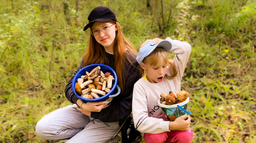 Набрали два ведра грибов. Настя и Вика