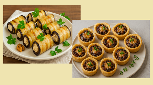 Мини-тарты с грибами и Рулетики из баклажанов с орехово-сырной начинкой