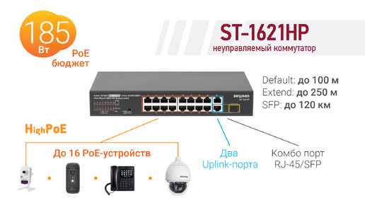 Коммутатор BEWARD ST-1621HP: 16 портов RJ-45 High PoE 30W, 2x Uplink 1000 Мбит/с RJ-45 + SFP/RJ-45