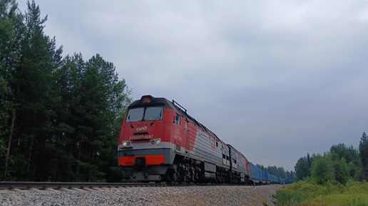 2ТЭ25КМ-0287 с контейнерным грузовым поездом и приветливой бригадой следует по перегону Сыктывкар-Човью