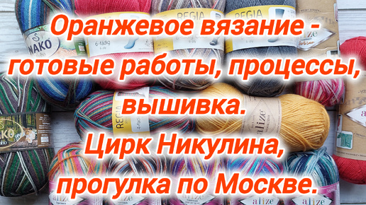 Оранжевые вязаные работы: носки, салфетки, джемпер. Прогулка по Москве, цирк Никулина. Процессы, вышивка, рецепт.