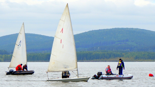 Гонки парусных швертботов луч на фоне уральских гор