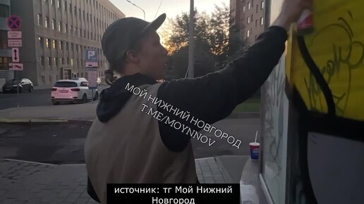 «Ну а че, ты меня напугал что ли?» Парень без стеснения изрисовал фасад дома на площади Горького в Нижнем.