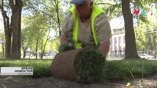 Подрядная организация завершает укладку газона в сквере на севере Волгограда