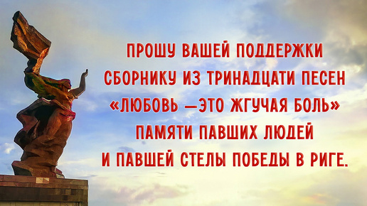 ПРОШУ ВАШЕЙ ПОДДЕРЖКИ СБОРНИКУ ИЗ ТРИНАДЦАТИ ПЕСЕН «ЛЮБОВЬ — ЭТО ЖГУЧАЯ БОЛЬ» ПАМЯТИ ПАВШИХ ЛЮДЕЙ И ПАВШЕЙ СТЕЛЫ ПОБЕДЫ В РИГЕ.