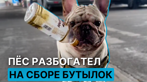 Французский бульдог зарабатывает на сборе пластиковых бутылок