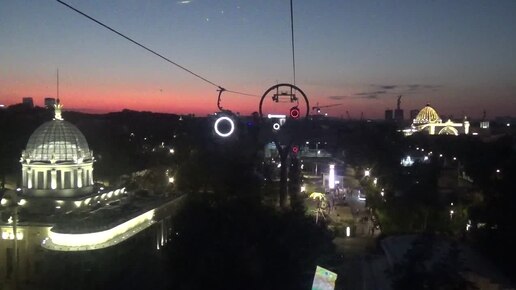 Вид на ВДНХ в вечерней подсветке из вагончика "Воздушного трамвая"