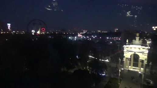 ВДНХ в вечерней подсветке. Виды из вагончика "Воздушного трамвая"