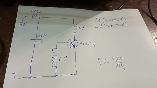 Качер Бровина на кт603а от 5 вольт, f=500 кГц. Осциллограмма коллектор + база. Схема