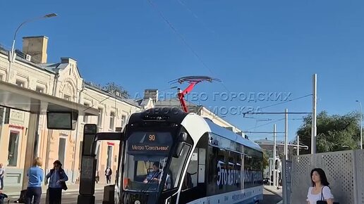 Работа современных трамваев с автономным ходом на маршруте №90 в центре Москвы