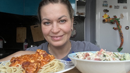 МУКБАНГ ПАСТА С ОХОТНИЧЬИМИ КОЛБАСКАМИ/САЛАТ/MUKBANG ЕДА ОБЖОР