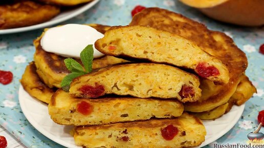 Ароматно и сытно. Оладьи из тыквы, с вяленой вишней