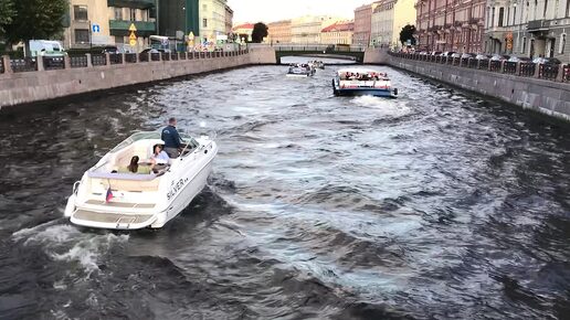 Пешеходный мостик, прогулочные кораблики и катера на канале
