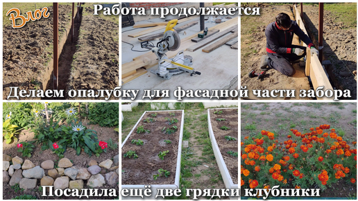 Влог за неделю. Работа продолжается. Делаем опалубку для фасадной части забора. Посадила ещё две грядки клубники 🍓