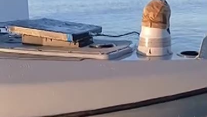 Один из уцелевших украинских БЭК-носителей, участвовавших в атаке на Туапсе На корпусе катера расположены белые "ящики" с FPV-дронами, запускаемыми со специальных направляющих.