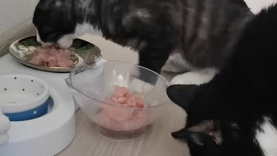 Ребятки трапезничают. Дуся, как эстетка, в которой видимо течет голубая кровь есть с лапы, ну а Сема... Семочка, как все))