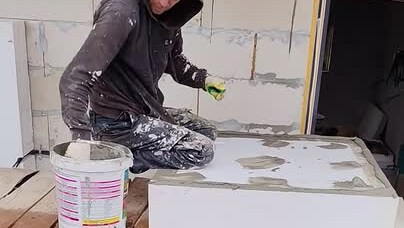 Приклейка фасадного пенопласта ППС16ф 200мм на ровную кладку. Нанесение клея по периметру листа, девять ляпух в середину листа.