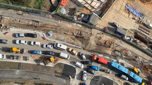 Движение на благоустраиваемой улице Крылатские холмы, где делают сужение дороги по одной полосе в каждую сторону, опять затруднено