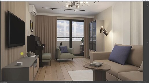 Гостиная с арочными и реечными панелями, уютная теплая палитра с темно-синими акцентами. 3D-визуализация в Планоплан.