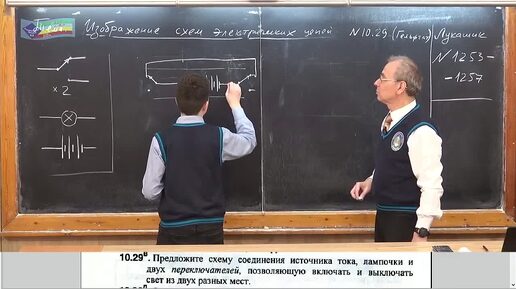 Задача на схему соединения источника тока, лампочки и двух переключателей, позволяющих включать и выключать свет из двух разных мест